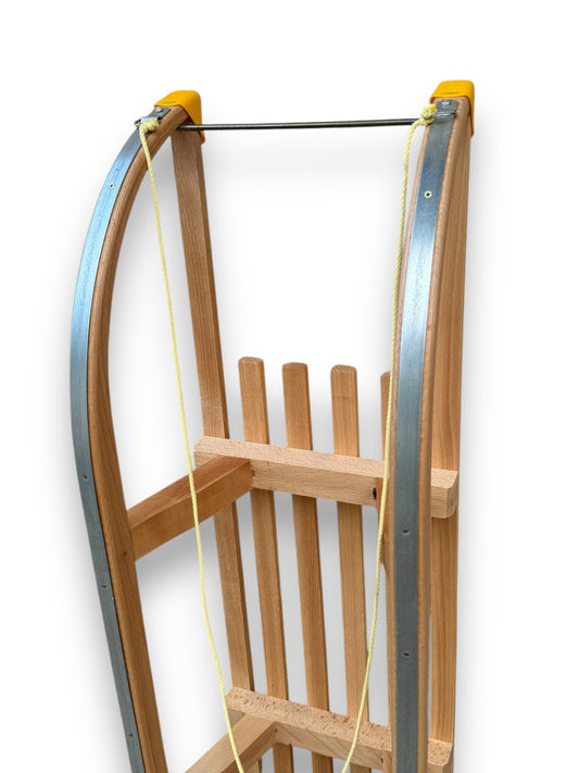- Zvite lesene sanke odlikuje elegantno zaobljena oblika, ki omogoča izboljšano vodljivost na snegu. Njihova športna zasnova in zelena vlečna vrv zagotavljata popolno ravnovesje med estetiko in funkcionalnostjo, kar jih naredi posebej primerne za dinamično sankanje.
